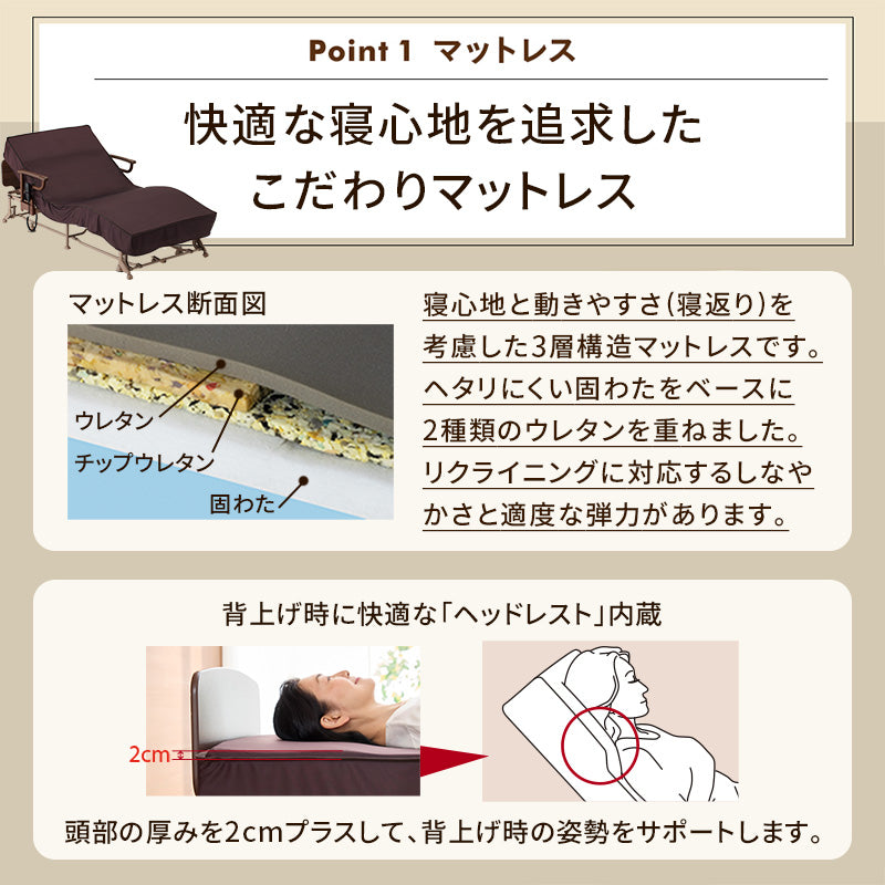 寝心地と動きやすさ(寝返り)を考慮した3層構造のマットレスです。頭部はチップウレタン層の厚みを2cmプラスして、背上げ時の姿勢をサポートします。