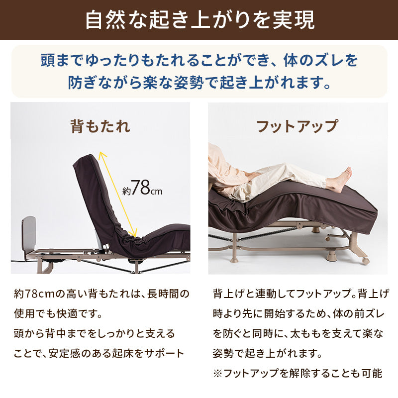 腰から起き上がり、頭を支えながらゆったりと起き上がり、背上げと連動してフットアップ。背上げ時より先に開始するため、身体の前ズレを防ぐと同時に、太ももを支えて楽な姿勢で起き上がれます。※フットアップを解除することも可能です。