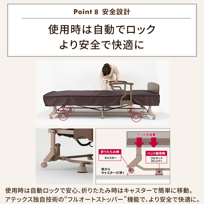 使用時は自動ロックで安心、折りたたみ時はキャスターで簡単に移動。アテックス独自技術の“フルオートストッパー”機能で、より安全で快適に。