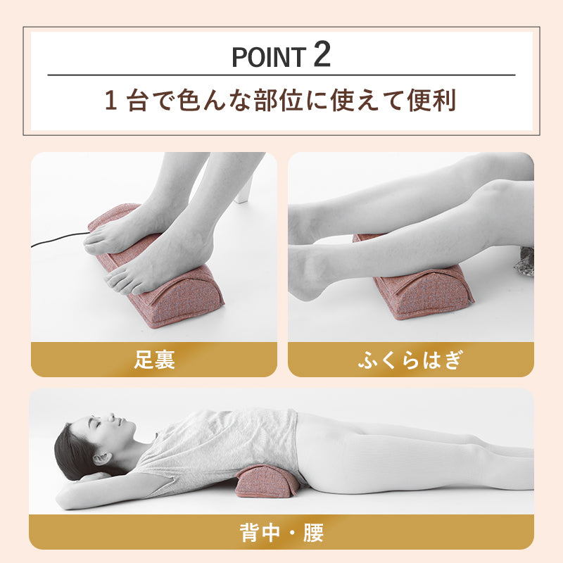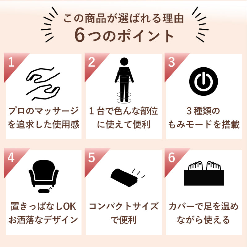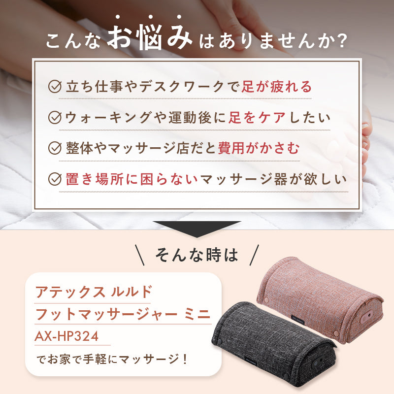 フットマッサージャー ミニ AX-HP324 こんなお悩みありませんか 疲れた足裏を集中ケア この製品は効果・効能が認められた医療機器です この商品が選ばれる6つのポイント プロのマッサージを追求した使用感 1台でいろんな部位に使えて便利 3種類のもみモードを搭載 空間になじむおしゃれなデザイン コンパクトサイズで便利 温めながら使える その他機能 カーアダプタを使えば車の中でもマッサージ インテリアに溶け込む2カラー ピンク ブラック 1年保証 安心の国内メーカー ショールームでもご体験いただけます!