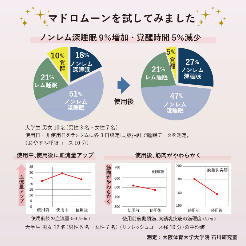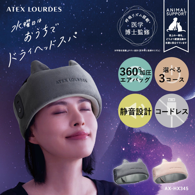 ドライヘッドスパ マドロムーン AX-HX345 医学博士が監修の「呼吸リズム」を搭載した、自宅でできるドライヘッドスパ。デスクワークの合間等に使う「リフレッシュコース」もあります。こめかみや後頭部を360度ケアし、10分間の心地よい刺激が、疲れた気分を整えます。 仕事で長時間PCやスマホを使用している。家事や育児で疲れている。質の良い睡眠を高めたい。など感じてる方には「マドロムーン」がおすすめ。 6つの英バッグが頭全体を加圧し、さらにエアカプセルが側頭部と後頭部をぐぐっと刺激します。 POINT1 選べる3つのコース。リフレッシュコース(弱・強)・・・頭周りをリズムエアで軽やかにケア・日中の気分転換やデスクワークの合間に。 おやすみ呼吸コース・・・親神前のひとときに。入眠しやすいリズムをマデロムーンが導きます。リズムに合わせて呼吸することで入眠のしやすさをサポートします。 マドロムーンを試したところ、ノンレム深睡眠9%、覚醒時間5%減少しました。 POINT2 静音設計 内部構造を小型化し、静音性も向上しました。耳元でも気にならない静かさでリラックス時間を快適に。 POINT3 簡単装着 面ファスナーで簡単装着。サイズ調整もできます。頭周囲サイズ:51~61cm。お手入れ簡単。 POINT4 収納できるねこ耳デザイン かわいいねこ耳デザインは、隠してアレンジもOK! POINT5 スマート設計 従来品は、エアポンプなどの構造が大きく、本体とは別に設ける必要がありました。本製品は静音性も高く、全ての内部機構部を纏めたスマート設計です。 その他 10分自動オフタイマー。充電式コードレス。カラーはグレーとピンクの2種類。 1年保証 ショールームでもご体験いただけます!
