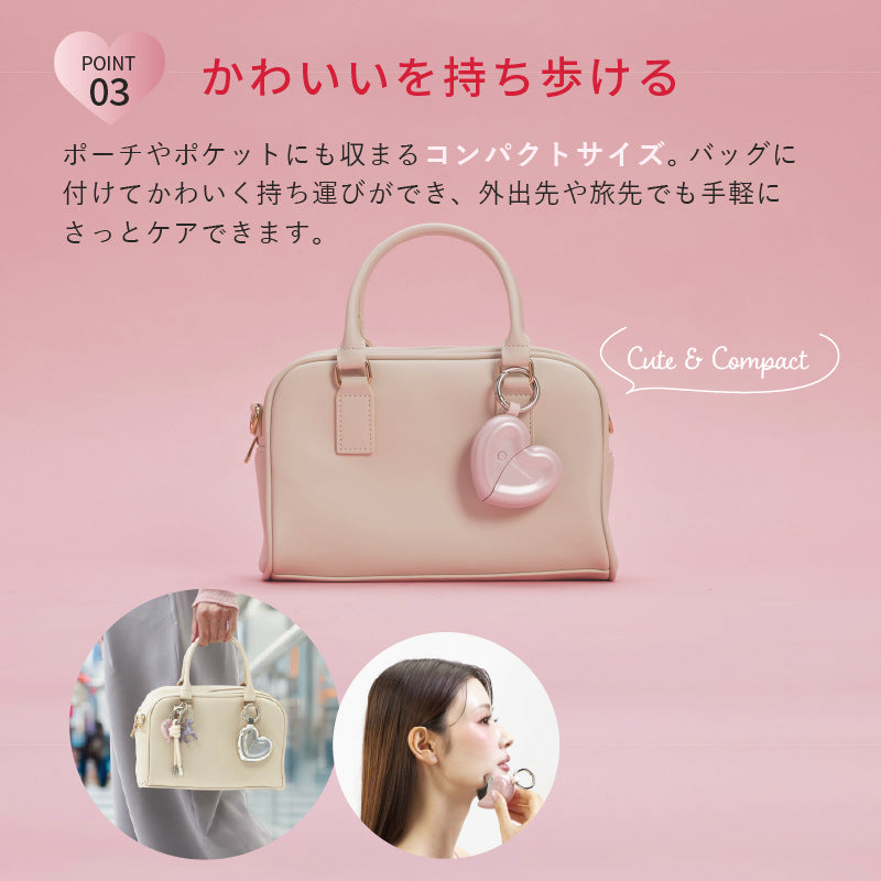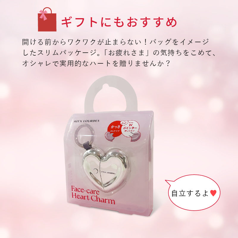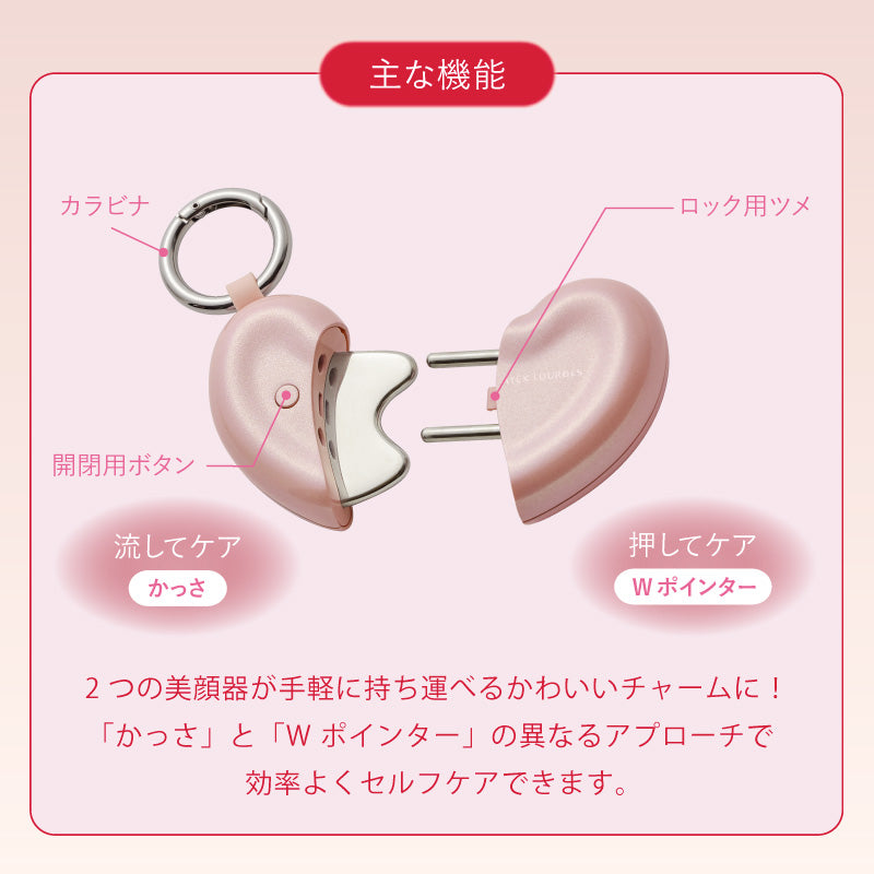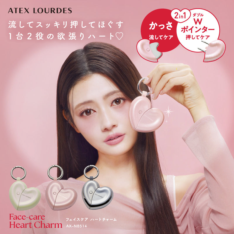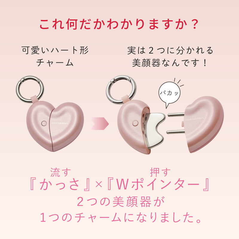 フェイスケア ハートチャーム AX-NB514 いつでもどこでもかわいく即ケア♡ そのどんより溜め込んでいませんか?朝、枕のあとが消えない、フェイスラインがぼんやりしてきたなどひとつでも当てはまったらハートの出番です。 これ何だかわかりますか?可愛いハート形チャームが実は2つに分かれる美顔器なんです! 2つの昨日が手軽に運べるかわいいチャームに!「かっさ」と「Wポインター」の異なるアプローチで効率よくセルフケアできます。 POINT1 かっさで流してケア。プレートの山や谷の部分を肌にフィットさせ、気になる部分を流してアプローチ。顔周りだけでなく、腕や脚にも使えます。 かっさの使い方 独自カーブが顔まわりなどにフィット。 POINT2 Wポインターで押してケア。バネの反発で表情筋をやさしく刺激。約2cm間隔の2本のポインターが独立したバネ構造で肌の凹凸にピタっとフィット。 Wポインターの使い方 バネの反発で筋肉へアプローチ。 POINT3 ポーチやポケットに収まるコンパクトサイズ。バッグに付けてかわいく持ち運びができ、外出先や旅先でも手軽にさっとケアできます。 POINT4 グリッターピンク、オーロラホワイト、メタリックシルバーのきらめく3カラーからお選びいただけます。 バッグをイメージしたスリムパッケージ。ギフトにもおすすめです。 ショールームでもご体験いただけます!