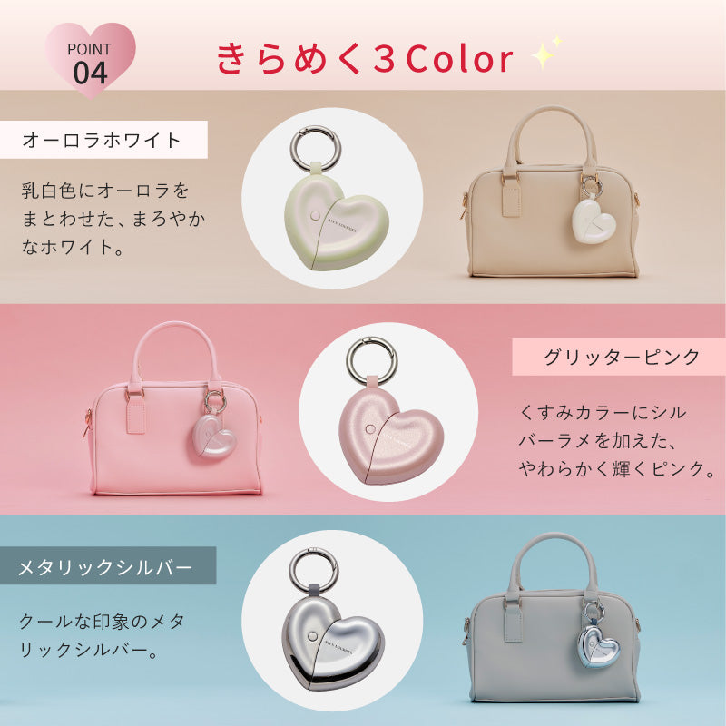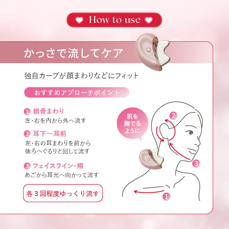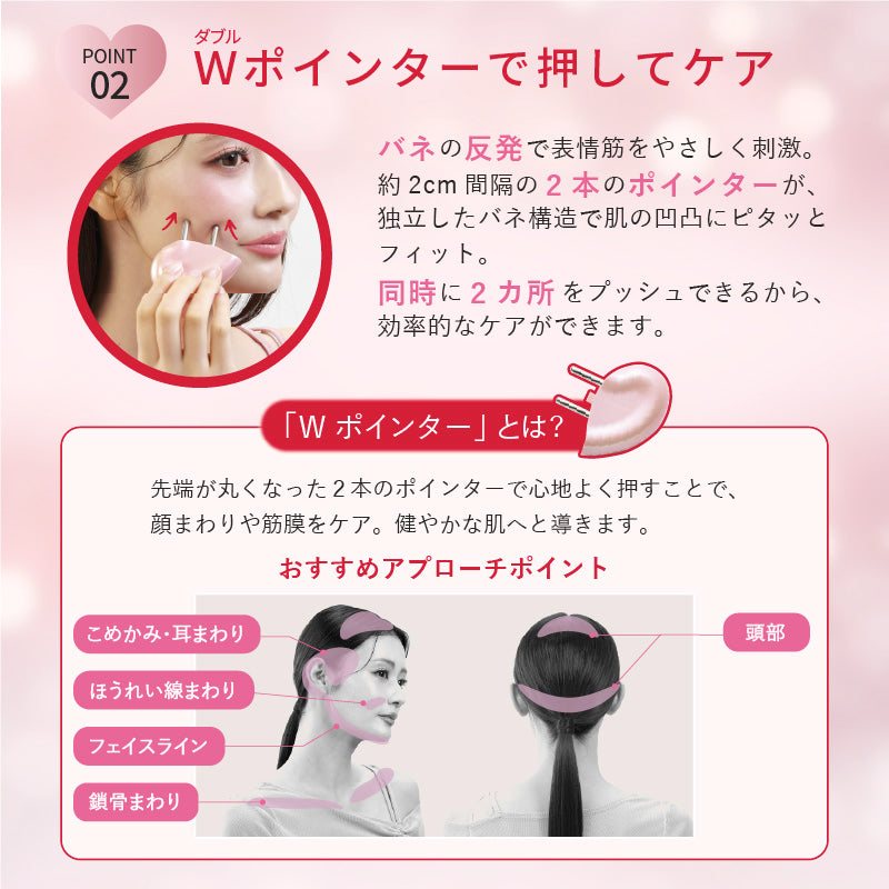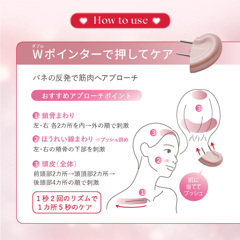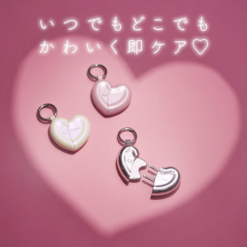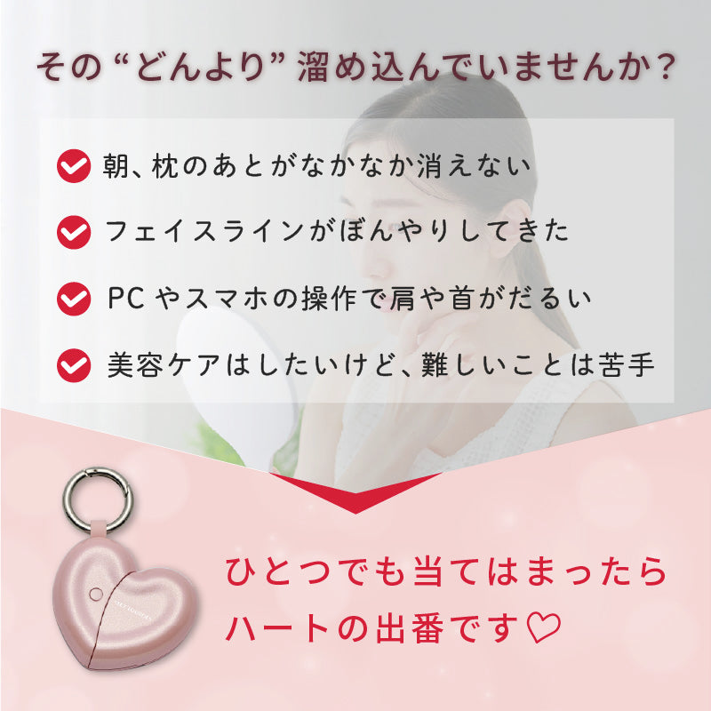 フェイスケア ハートチャーム AX-NB514 いつでもどこでもかわいく即ケア♡ そのどんより溜め込んでいませんか?朝、枕のあとが消えない、フェイスラインがぼんやりしてきたなどひとつでも当てはまったらハートの出番です。 これ何だかわかりますか?可愛いハート形チャームが実は2つに分かれる美顔器なんです! 2つの昨日が手軽に運べるかわいいチャームに!「かっさ」と「Wポインター」の異なるアプローチで効率よくセルフケアできます。 POINT1 かっさで流してケア。プレートの山や谷の部分を肌にフィットさせ、気になる部分を流してアプローチ。顔周りだけでなく、腕や脚にも使えます。 かっさの使い方 独自カーブが顔まわりなどにフィット。 POINT2 Wポインターで押してケア。バネの反発で表情筋をやさしく刺激。約2cm間隔の2本のポインターが独立したバネ構造で肌の凹凸にピタっとフィット。 Wポインターの使い方 バネの反発で筋肉へアプローチ。 POINT3 ポーチやポケットに収まるコンパクトサイズ。バッグに付けてかわいく持ち運びができ、外出先や旅先でも手軽にさっとケアできます。 POINT4 グリッターピンク、オーロラホワイト、メタリックシルバーのきらめく3カラーからお選びいただけます。 バッグをイメージしたスリムパッケージ。ギフトにもおすすめです。 ショールームでもご体験いただけます!